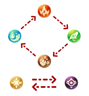接下来要跟各位分享一下圣骑之王内的属性资讯,游戏中有六大属性两个属性组,水火风土一个属性组,这四个属性分别是水剋火、火剋风、风剋土、土剋水。而除了四个元素属性外还有光暗这个属性组,两个属性是彼此相剋的。简单的说相剋的关係大概就像下面那张图。(我想这些基本的大家应该都知道XD)。