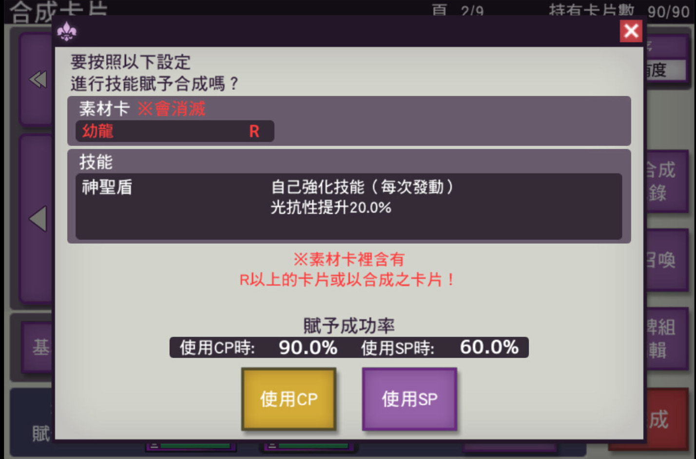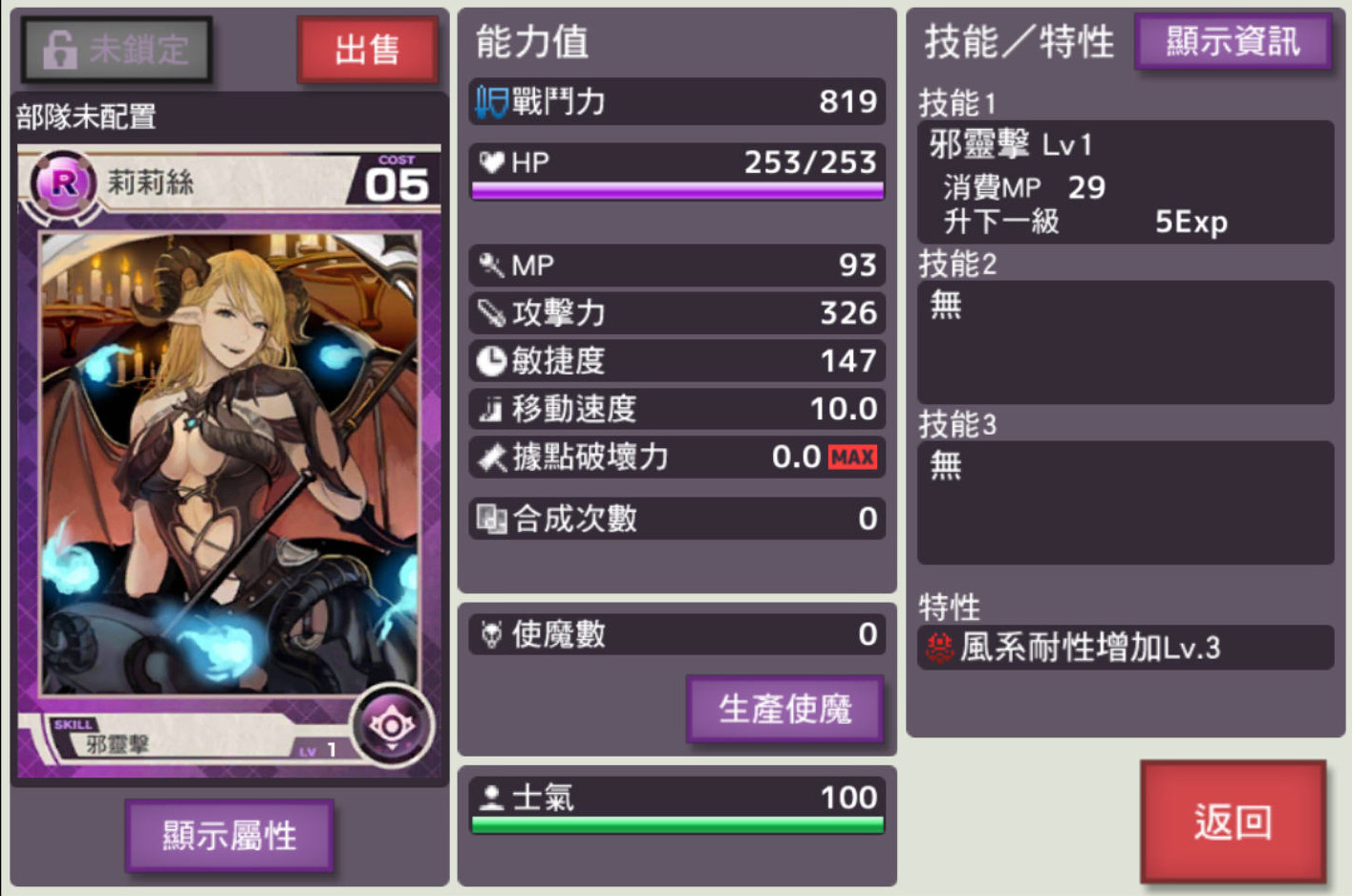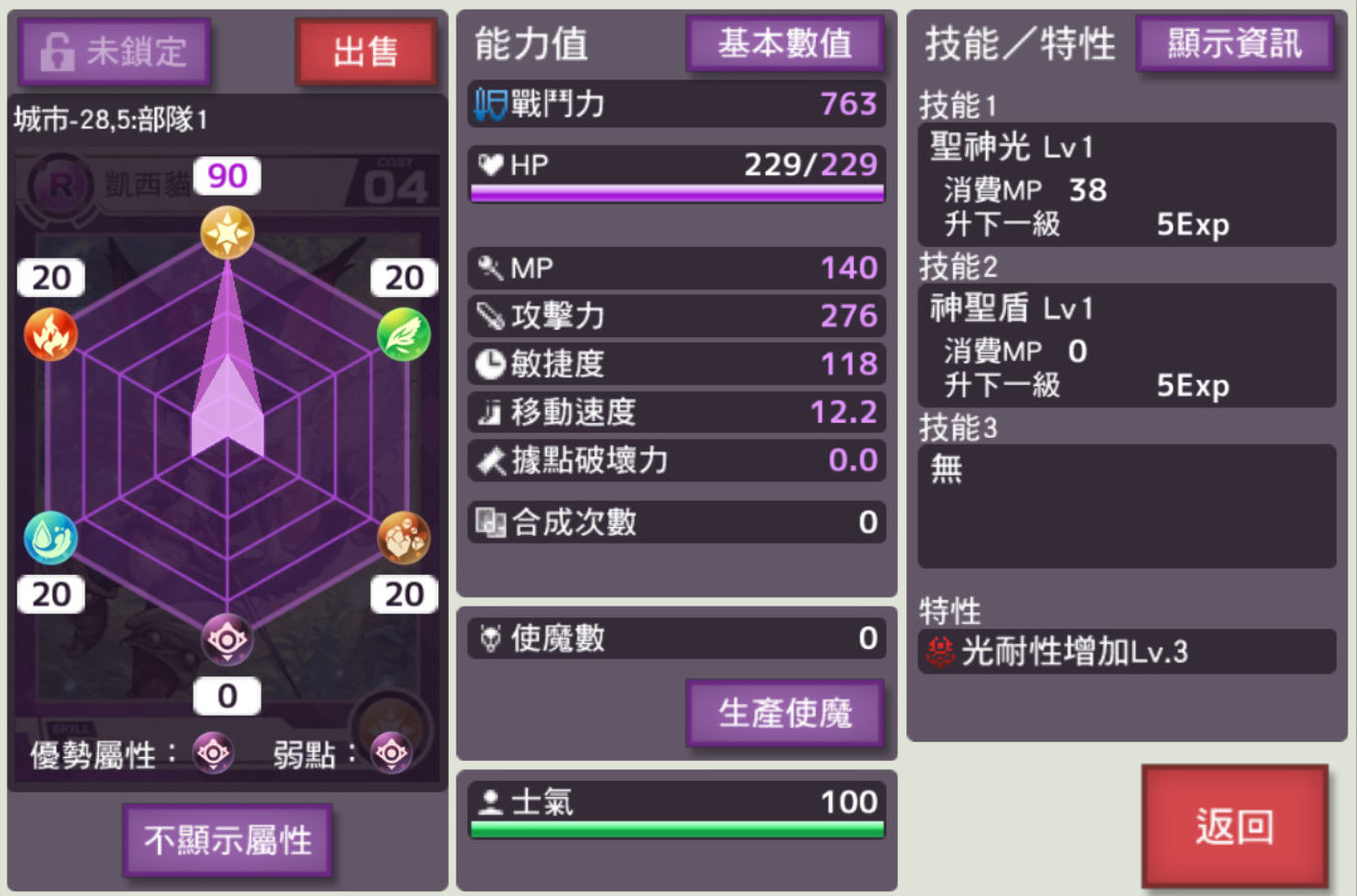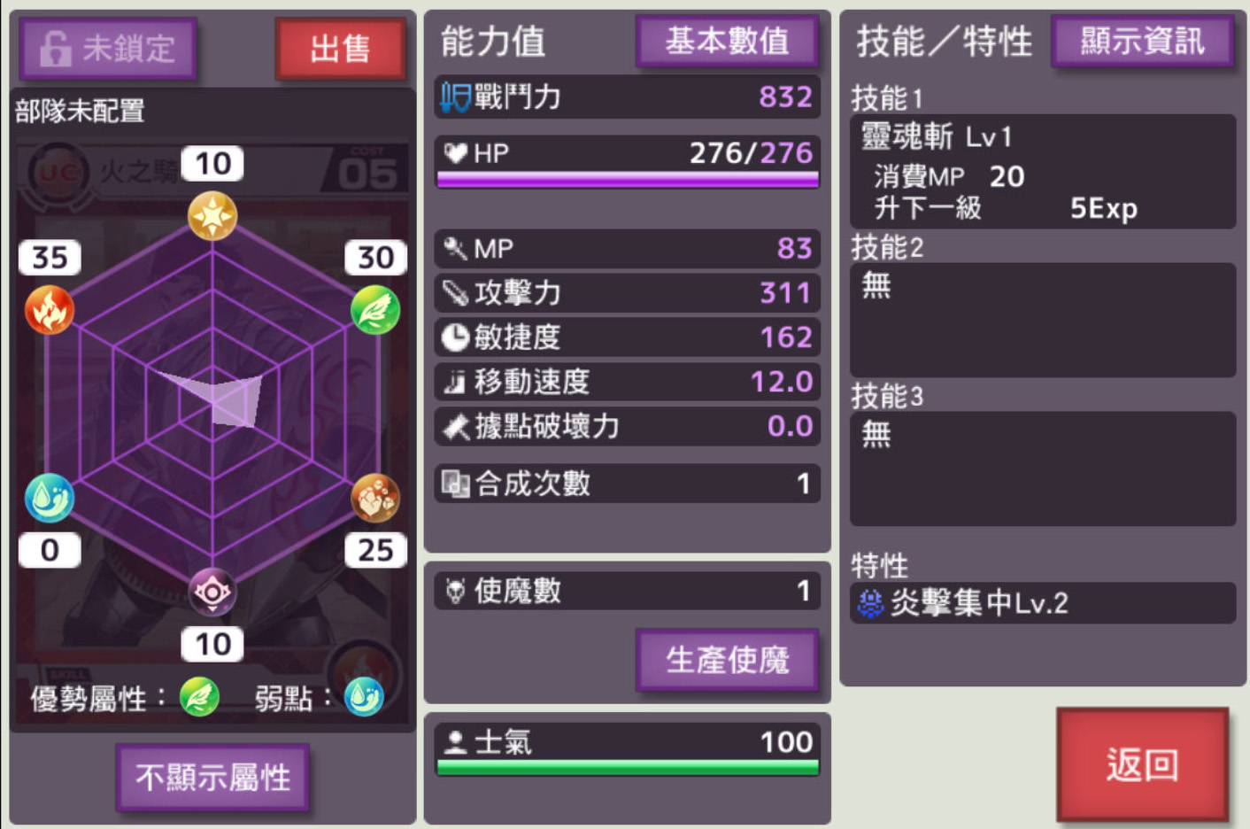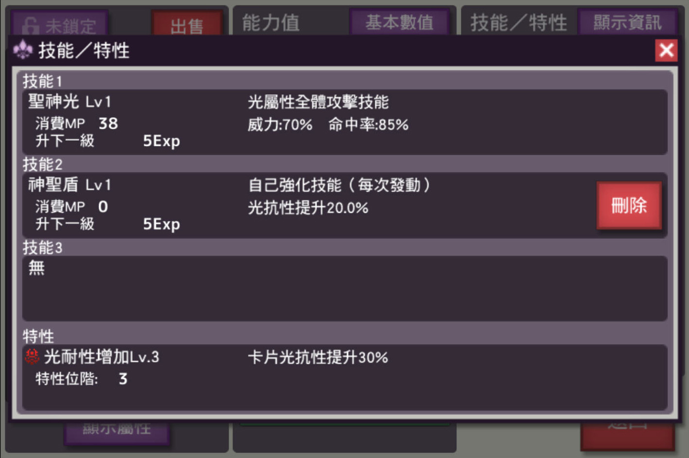 备註:同属性(火风水土组)的抗性UR、SR、R卡是40,UC跟C卡是35 同属性(光闇组)的抗性UR是45、SR跟R是40,光闇组没有UC跟C卡。(以上全都是基本属性,未加特性及技能前的状态。) |