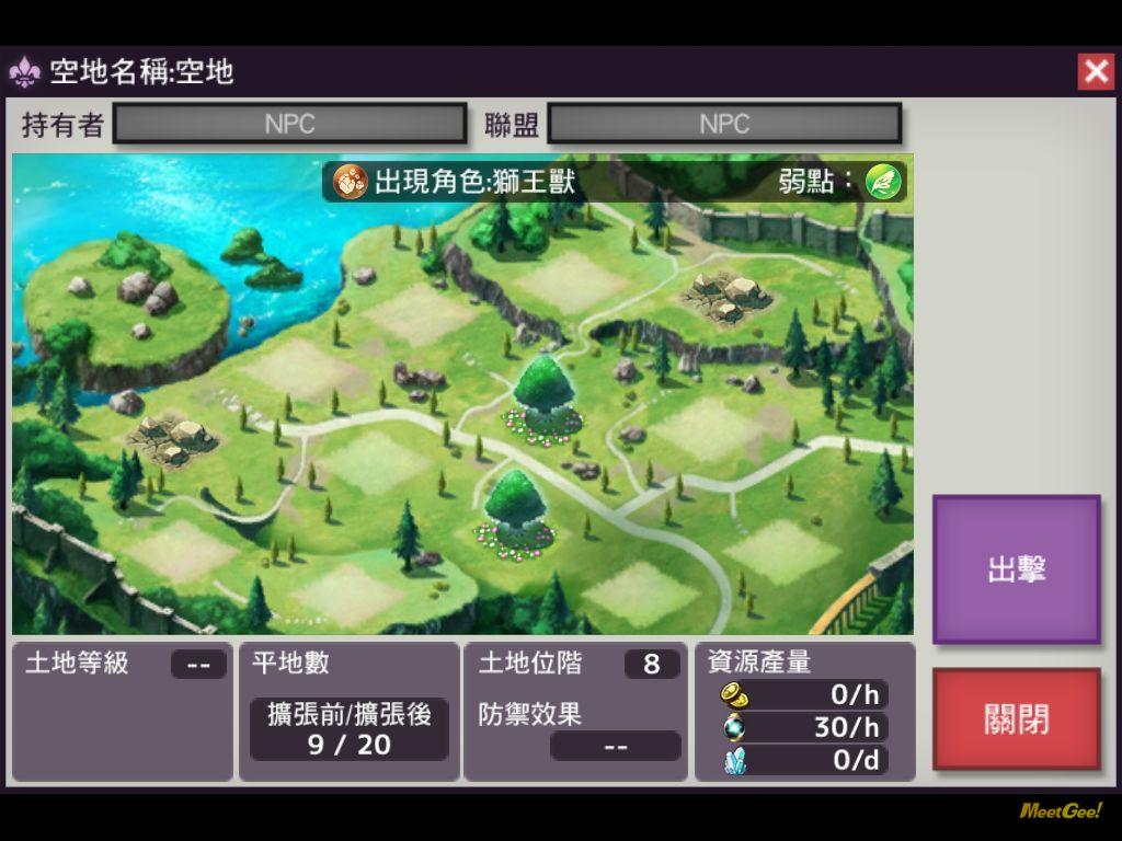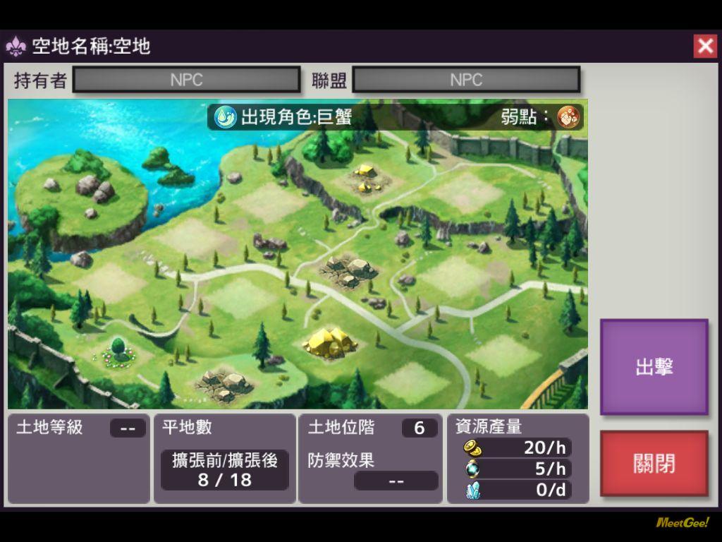 土地位阶5 、7 、9 的基本平地数就比其他位阶高,是设立据点的好目标,想要快点建二城的话就打下位阶5 的土地去盖,毕竟想打赢位阶7 战斗力要冲到155000 短时间内很有难度,越早盖二城就能更快累积资源,对游戏进展影响越大;而升级土地提高生产量的高级资源地建议选位阶8 产金币的土地,并把它升到十级,金币产量每小时将会逼近800 相当可观,不过位阶8 的土地并不多,在后期也是抢很凶的重点资源地。