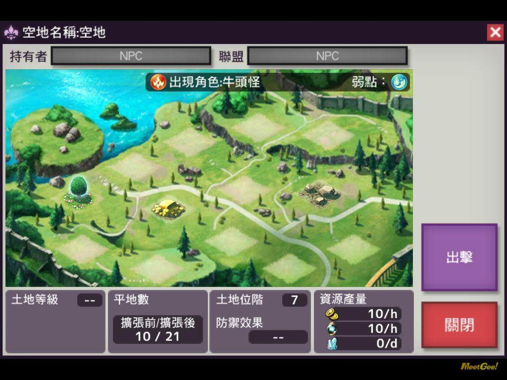 初期战斗力有限,玩家只能先从占领3 、4 级土地开始扩张,不要妄想存到足够使魔再一次征服5 级以上的高级资源地,每次出征都会把士气花光,等回满要六小时,一来一往花费时间太长,所以持续往冥王军据点扩张土地是比较好的,每次出征会扣一点声望,别忘了斜角也可以攻击,以最少的攻击次数达到目标地节省声望,不要傻傻的只打直线、横列的土地,一开始占领的1 、2 级地不要浪费声望去升级,投资声望建议找5 级以上的资