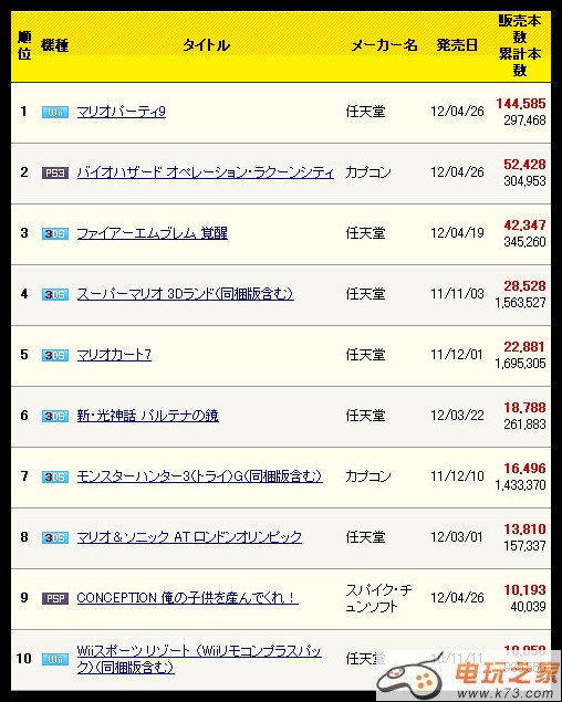 | 1 | Wii | 马里奥聚会9 | 任天堂 | 12/04/26 | 144,585 | 297,468 |