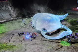 接著试玩的是头目战的部分,玩家要对抗有著坚硬甲壳的...呃...某种节肢动物。此时就必须发挥岩石皮克敏的特性,先将头目的硬壳打破,再指挥红色皮克敏攻击破去甲壳的肉身躯体。因為头目会跑来跑去,所以要使用 Wii U 游戏平板体感指标精确瞄準有点困难,有时候瞄到了正要攻击时头目就落跑了,看来还需要多多练习。不过最后还是成功打倒头目,还好没有两场皆败。