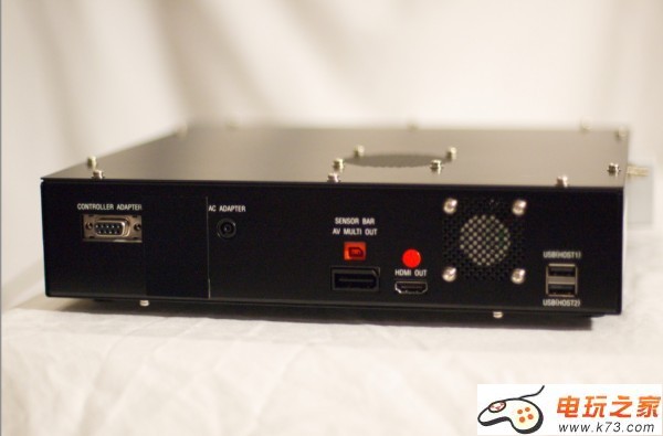如图所示这套开发套件没有支持远程显示的功能,没有任何光学载体;在这个阶段开发商只能通过网络下载。背面则有WII传统控制器和视频输出(HDMI)接口。