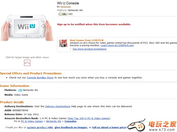 英国亚马逊网站放出WiiU主机的预购,预购页面现实发售日期为2012年7月14日,售价为200英镑(折合人名币2000元),预购页面只可以选择黑色主机.