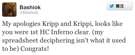 就在《暗黑破坏神3》美服1.03削弱怪物难度改版的前夕,知名玩家Kripp及Krippi使用了野蛮人以及祕术师的组合,顺利在昨晚将《暗黑破坏神3》炼狱难度的迪亚布罗击倒,取得游戏「专家级难度」全球第一组突破的荣耀,此纪录随即也在稍晚得到了游戏社群经理Bashiok
