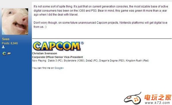 这段信息是Christian Svensson在CAPCOM官方社区中回答玩家提问时公开的。不过,他并没有明确表明游戏类型以及游戏的对象平台是什么。究竟是3DS游戏还是WiiU游戏呢?请留意我们的相关后续报道。