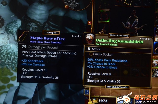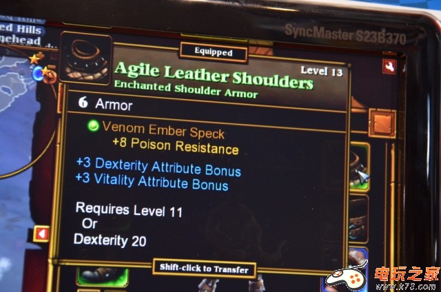 滑鼠滚轮可以拉近游戏画面在装备的掉落方面,由於角色等级低,因此还没有发现绿色或蓝色等级以上的物品,但在击败菁英怪时可以预期获得丰厚的奖励。物品监定的部份,则不需要卷轴或花费时间读取,点选右键即可直接辨识。