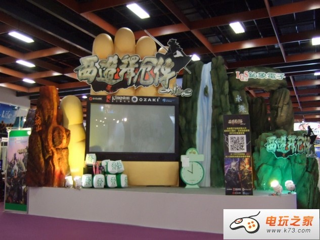 以火焰山、五指山、水濂洞等创意设计,还原拟真的西游风貌 舞台中央使用大型无接缝 140 寸萤幕,随时播放主题 CG 动画,让参观民众在现场将可观看清晰的游戏画面。