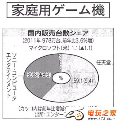 另一面,第二位的索尼的市场份额却大额减少了8.3%,达到了39.8%。虽然新掌机PSV的销量达到了40万台,但受到PSP的反压导致市场占有率减小。PS3的需求量也一反下降了5.9%,仅达到了146万台。继续下滑的MS的市场份额仅占到了1.1%,下跌了1.1%。和PSV一样,XBOX360由于缺乏好销的软件,导致了苦战的地位。在欧美由于Kinect的发售,其2011年的销量超过了PS3,但由于日本国内的蜗居式住宅环境的限制,使其无法普及。