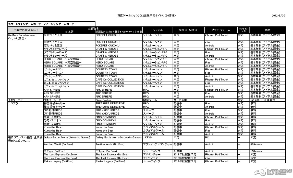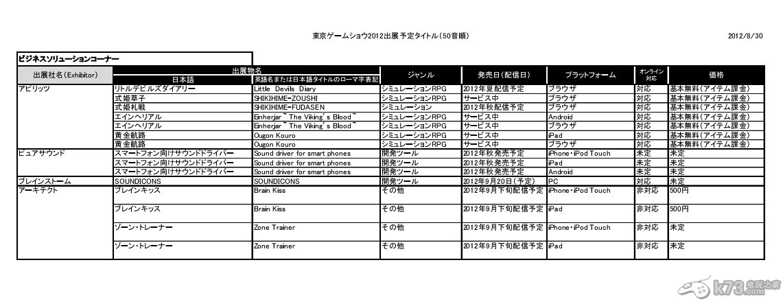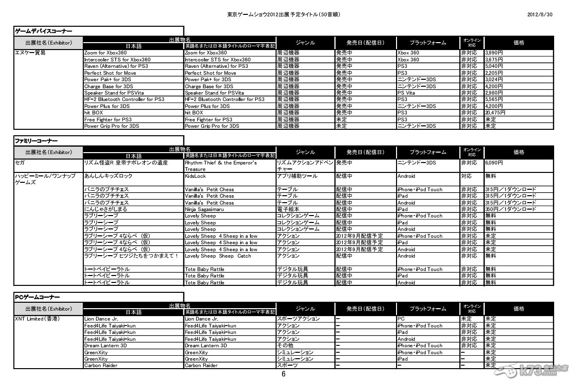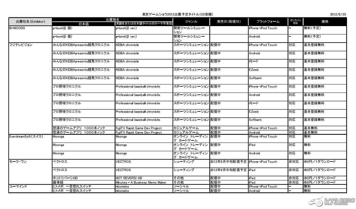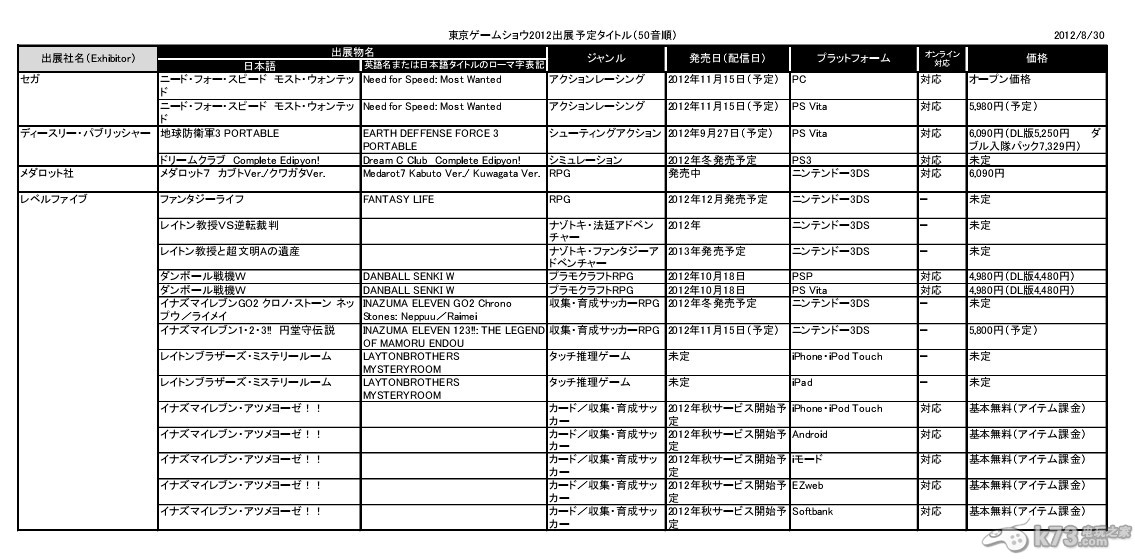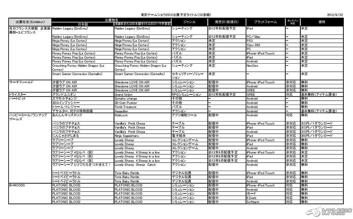 今天,东京电玩展举办方方面公开了今年的TGS 2012的全部出展公司及其旗下的出展游戏的名单,这里我们看到非常多备受期待的新作。当然,这里列出的游戏可能只是部分名单,说不定哪个厂商会带来玩家劲爆的消息呢!