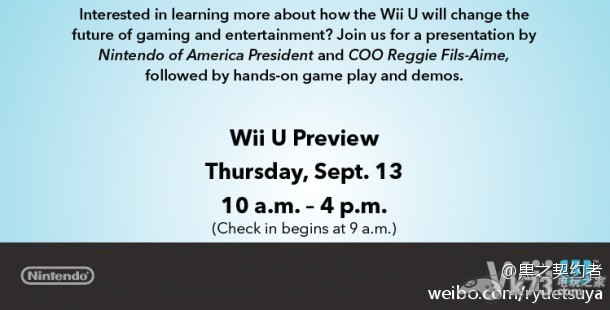 根据任天堂官方的最新Swapnote信息显示,任天堂方面将会在欧洲于9月13日举行一场专门的wiiu的网络直播会(Nintendo Direct),届时将会公布WIIU的具体信息及相关的发售日期等消息。