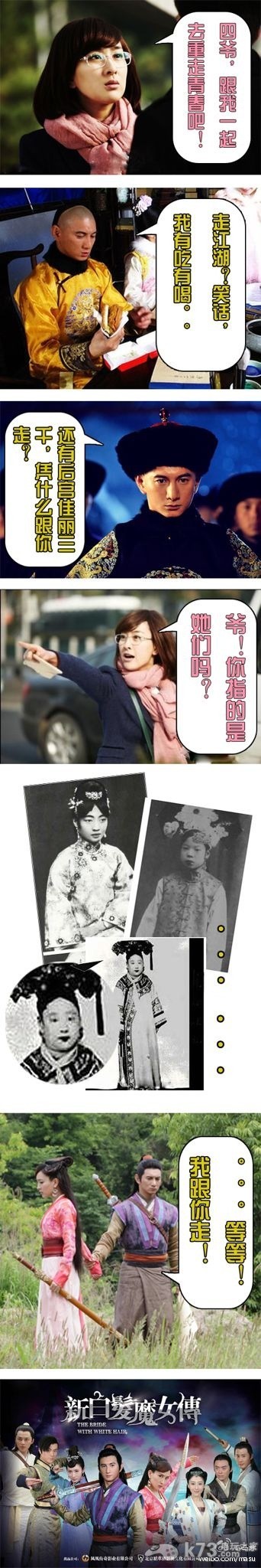 近日,一则以“四爷~~皇帝有神马好当的~~~还是跟姐去重走江湖吧!”的图文贴图在网络上红透了,被网友相继转载多次。图片中的两个主角为近日热播的电视剧《新白发魔女传》的两名男女主演吴奇隆和马苏由于饰演四爷和权筝这两名角色深入人心而被网络穿越恶搞,