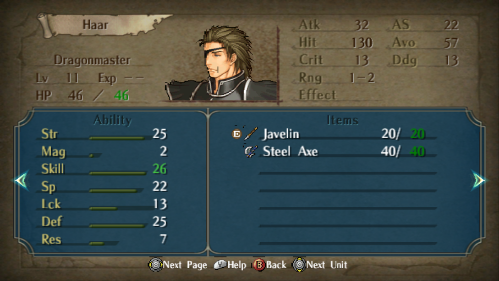 又是一个固定回合数的章节,可惜敌人密集度也太低了一点。哈鲁、玛夏和艾琳西亚都不介意多点经验,但是玛夏时间最紧,所以经验都喂给玛夏吧。结束的时候把投枪换给白鹭妹子,2-2可能用得到。