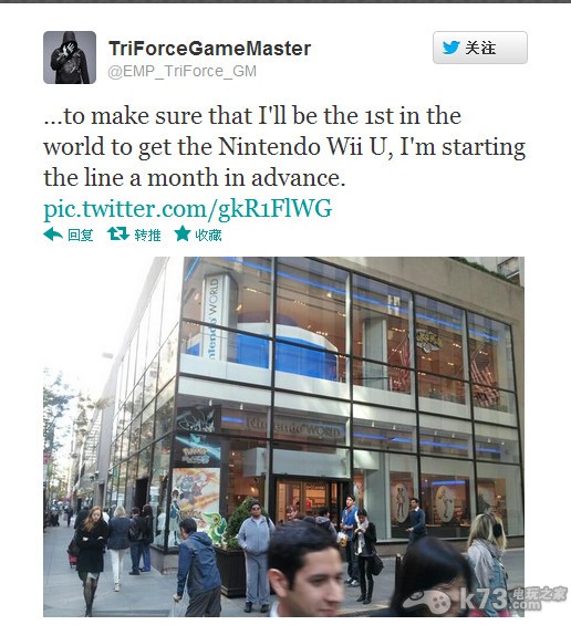 近日,Triforce Johnson在他的推特上公开宣布他将是第一个买到wiiu的玩家。目前他已经在曼哈顿市区的任天堂世界专营店门口安营扎寨,静等11.18主机首发那天的到来。