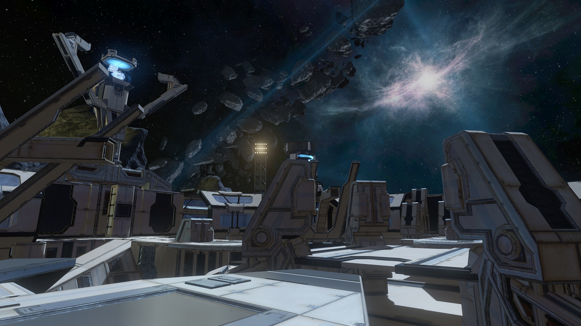 光环4的第10张对战地图漩涡的高清图片。漩涡是为大型团队杀戮设计的地图,场景是位于安魂星上的山谷,先行者建筑群是用作产生能量。