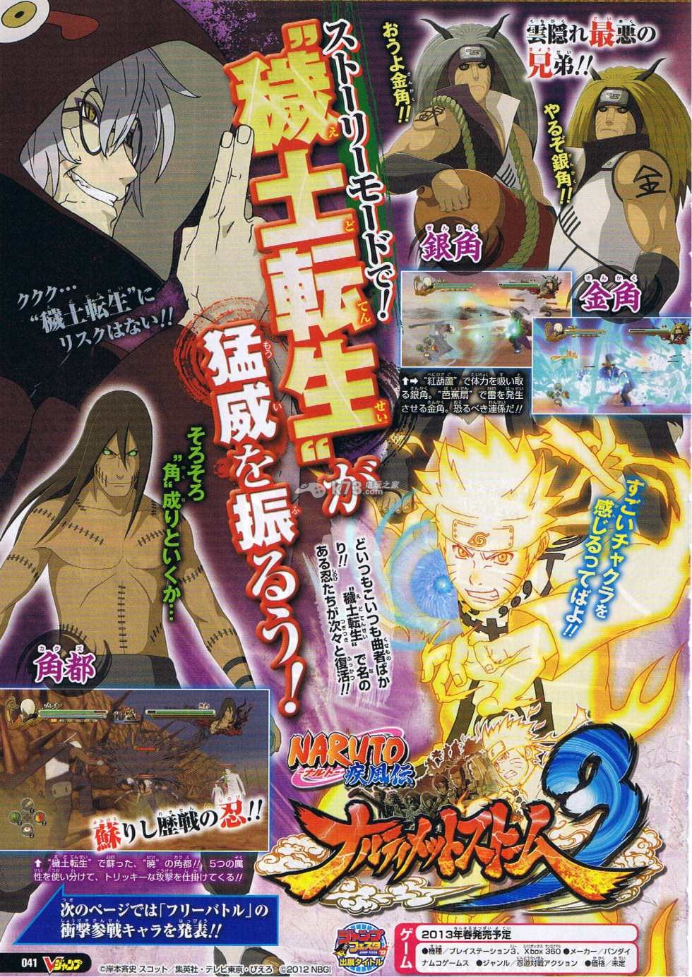 日前,网络上流出了两张清晰的家用机游戏《火影忍者疾风传 究极忍者风暴3》的杂志图,两张杂志图分别介绍了游戏中的故事模式的几名复活的新敌方角色以及我方的全部参战人柱力,以下是详情内容。