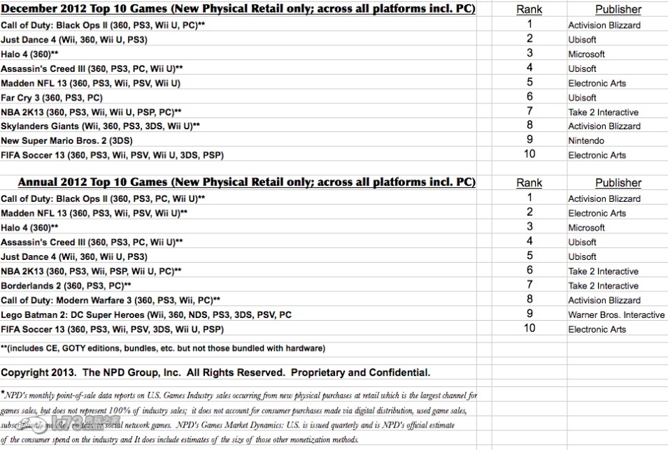 2012年年度最热销游戏排行榜则有了些许的变化,12月最热销游戏的第二名《Just Dance 4》被EA的体育大作《Madden NFL 13》所取代,第一名和第三名仍然是《使命召唤9 黑色行动2》和《光晕4》,而《新超级马里奥兄弟2》以及《小龙斯派罗 巨人》这两款作品也未能登上年度最热销游戏TOP 10的榜单。