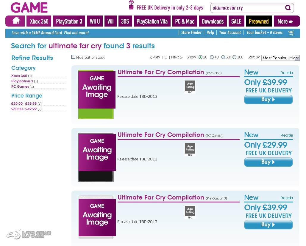 根据英国GAME的页面消息显示,这两款游戏都将会于2013年发售,《细胞分裂6 终极版》的统一价格为29.99英磅,而《孤岛惊魂3 终极版》的三个版本价格中家用机版本均为39.99英磅,PC版本为29.99英磅。