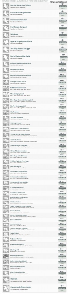 NBGI预定于2013年在PS3/Xbox 360主机上推出动作大作《火影忍者疾风传:究极风暴3》今日外网公开的游戏的成就列表,有兴趣的可以先看看。