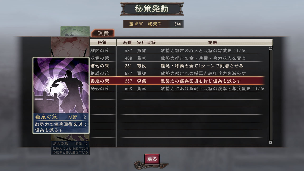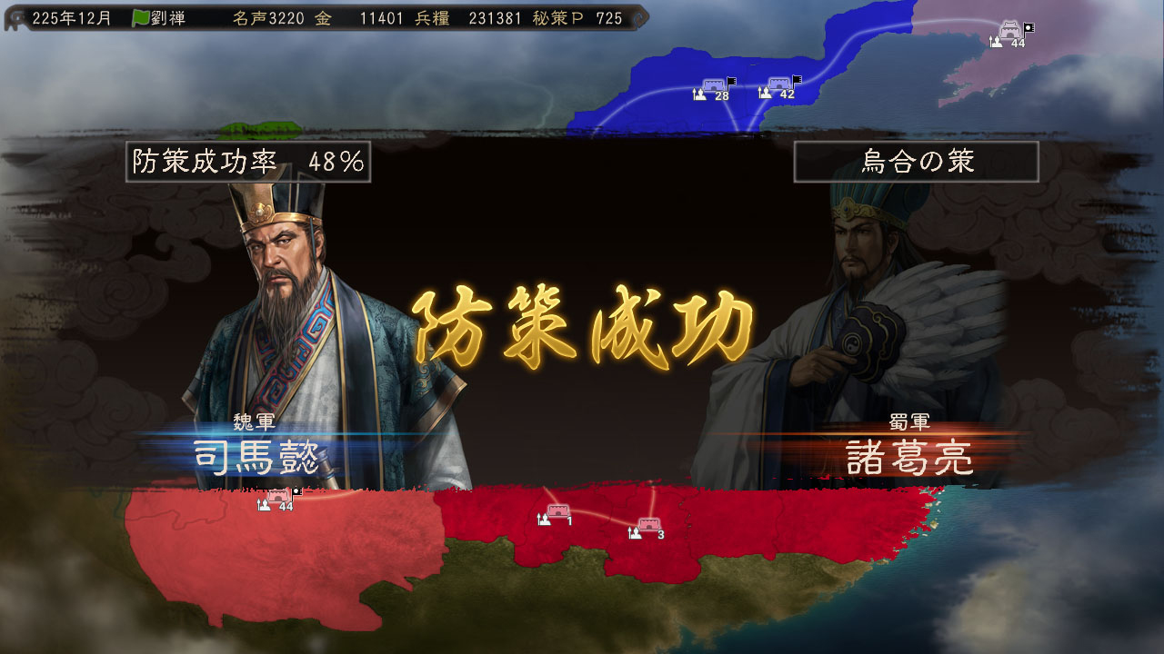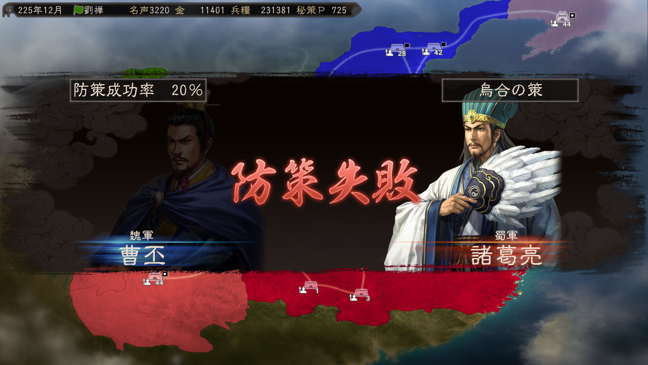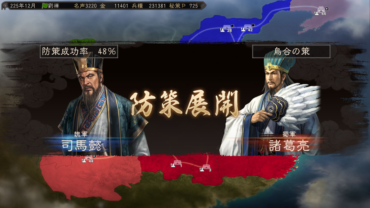 而在这次威力加强版新更新强化的秘策系统方面,不但加入了随着军师与君主不同,使用秘策时所需要消费的秘策点数各自不同(举例来说同样的秘策乌合之策,孔明只要271点就可以发动,但陆逊却需要355点才能发动,至于秘策点数的回復方面,除了可以随每回合时间经过上升之外,玩家们也可以透过兴建计略府设施并安插高智利的武将配属来让上升速度加快)的要素之外,另外还有可以防止敌人发动的秘策的对抗技防策登场,虽然防策一般而言成功率只有48%而已,但随着使用的军师能力愈高,成功率也会变得愈高,因此玩家们可以来好好利用,藉此来抵挡敌人所使用的秘策伤害。