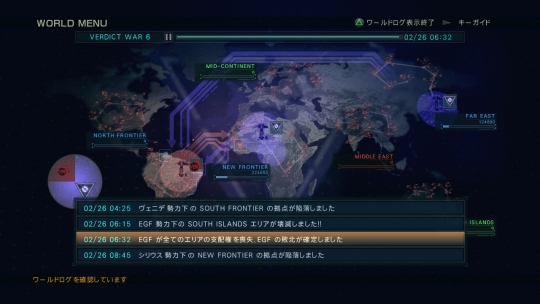 开战中盘的世界情势。各势力由自己的司令部发动作战,玩家可遵从指示,也可以随着自己的步调,自由发挥实力打败敌人。若据点快被攻破时,就会开始倒数计时。攻击方集中火力连续攻击,防守方则是死守阵营,阻止据点被攻破。