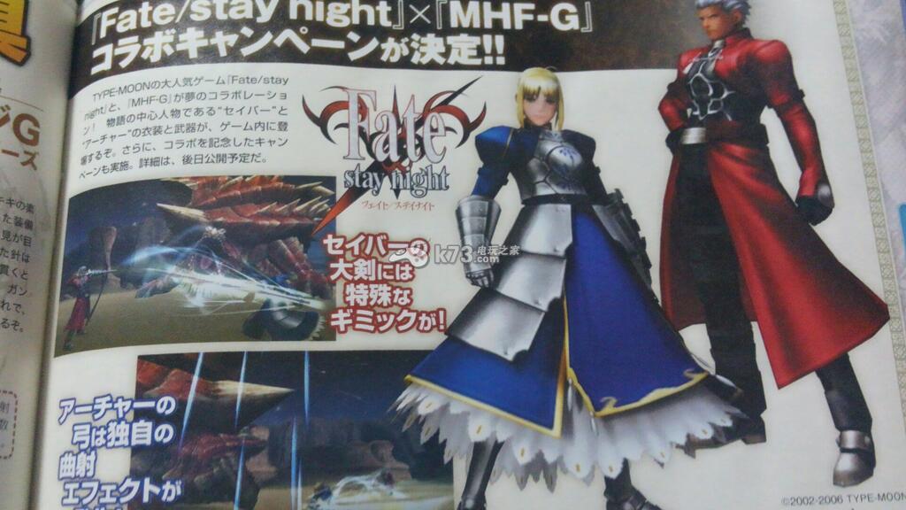セイバー和アーチャー的服装和武器均会出现在《怪物猎人边境g》的游戏世界里,官方将会在之后公开具体的情报,以下是杂志图详情。