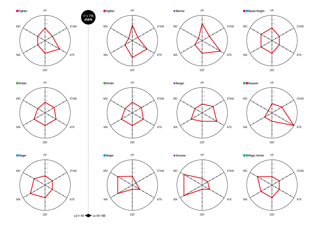 結論から言えば、Magよりも、FigとSor混成の方が全ての能力を高く出来る(バランスはお好みで) ,さらに覚者ならMKを使えば、STと魔防が追加で増やせる ,WarならもっとHPは増えるが、STや物防が下がる、それでもMagよりはマシ,ちなみに、Magで10まで上げた場合HP608なので、1902の上昇で2510になる。