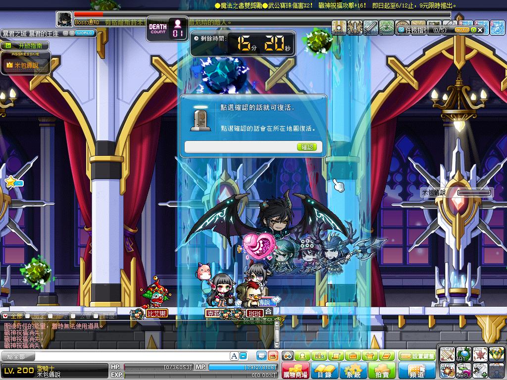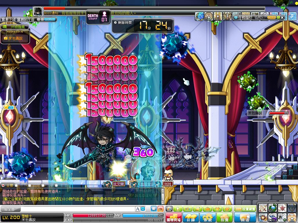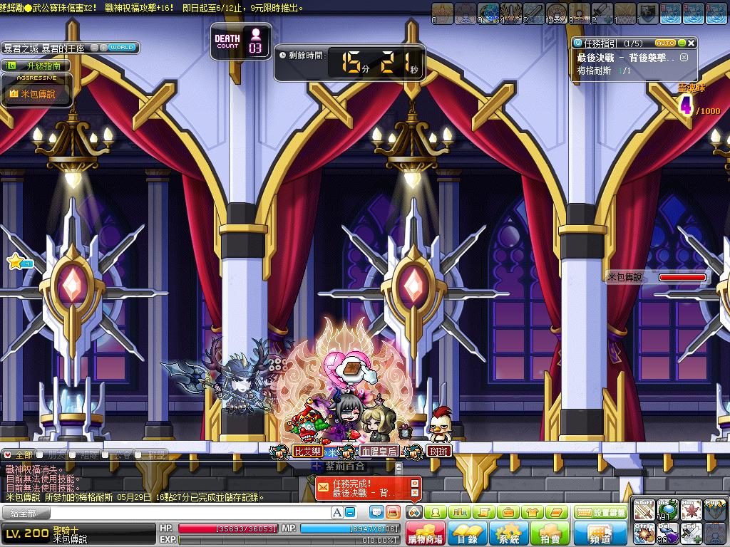 如图单打剩下时间15分~,小黑剩下3次复活机会了~绑BOSS的冷却时间是120秒(2分钟)...所以不可能每下次复活都去绑他!!无敌时间冷却更久则是5分钟才能用一次~所以整场只有开头进去打他的时候先绑后施放无敌完...之后等到BOSS残血后再开一次~确保打他100%不会被陨石干扰~放心击溃他的血量!!另外附上前5场中拍摄差点打赢的画面~... (说真的一直死到我都想放弃了= =)