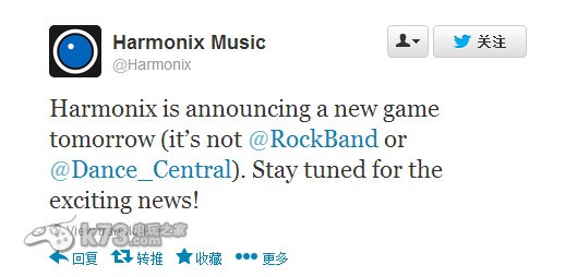 “Harmonix将于明天公开一款全新的游戏(即不是《摇滚乐队Rock Band》续作也不是《舞蹈中心Dance Central》新作). 敬请关注的令人兴奋的消息!”