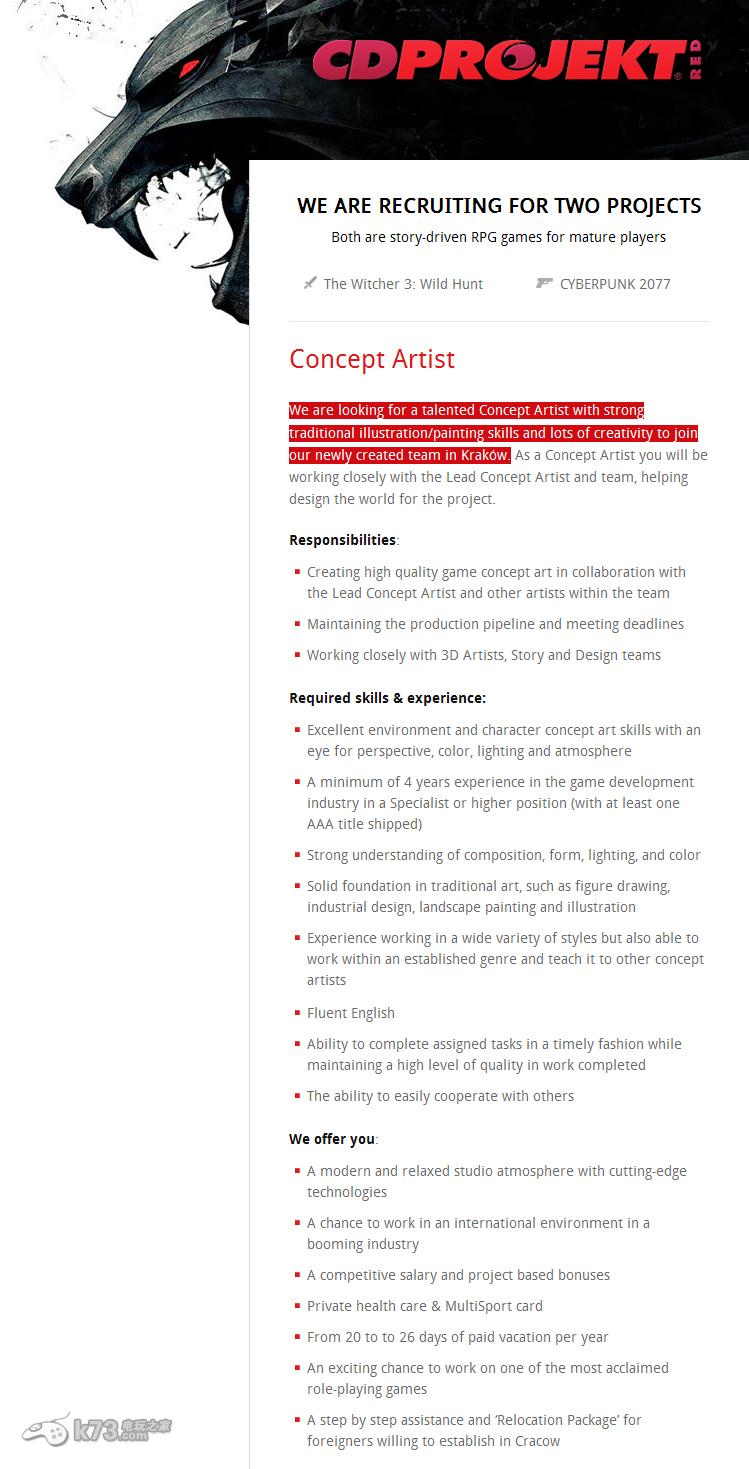 CDProjekt Red公开招聘《巫师3》《赛博朋克2077》美工