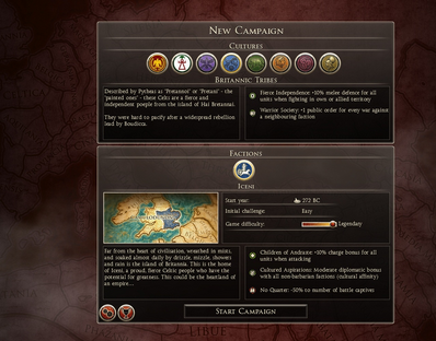 现在就让我们踏入罗马时代.........部落Iceni,传奇难度。如下图所示,Iceni的特性里基本没有有用的。