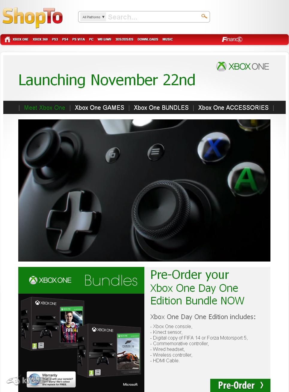 shopto官网以巨大的广告位展示了Xbox ONe主机的发售日期,为11月22日,这个发售日期针对澳大利亚,奥地利,巴西,加拿大,法国,德国,爱尔兰,意大利,墨西哥,新西兰,西班牙,英国,美国世界13个国家和地区,其它地区的发售日期为2014年,日版发售日期未公开。首发限定版的游戏可以包含《极限竞速5》和《FiFa14》中的任一一款游戏,还包含一套有线头戴设备。