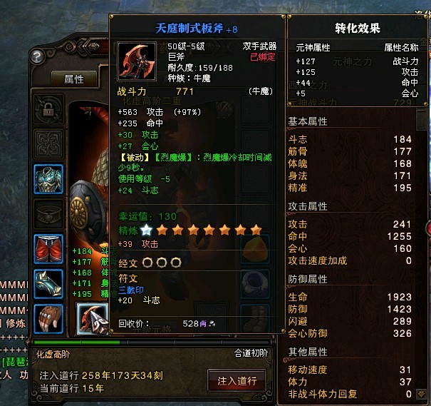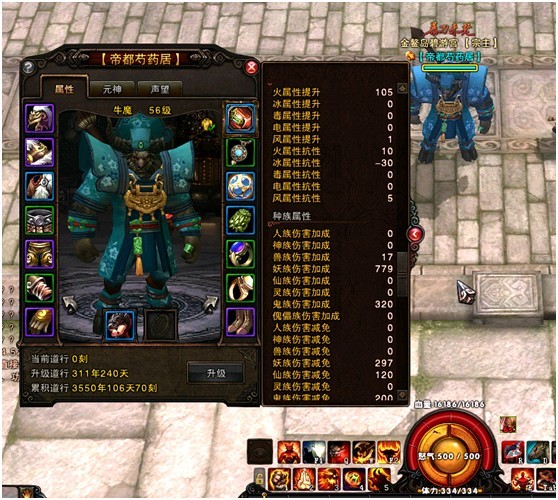 元神是一定要搞的,堆属性基本全靠元神,我现在元神化虚高阶,提供180左右的五围属性。元格要选择性地点,武器必须先点满,能加一百多攻击力,武器完了是戒指,然后鞋子裤子。鞋子裤子55之前选择加妖伤的,55选择加火的,我的元神给我提供了12点火属性,全靠戒指鞋子裤子,建议50级卡会等级升元神,至少卡一周,顺便刷满二十次宝林狩猎,妥妥500年点元神。