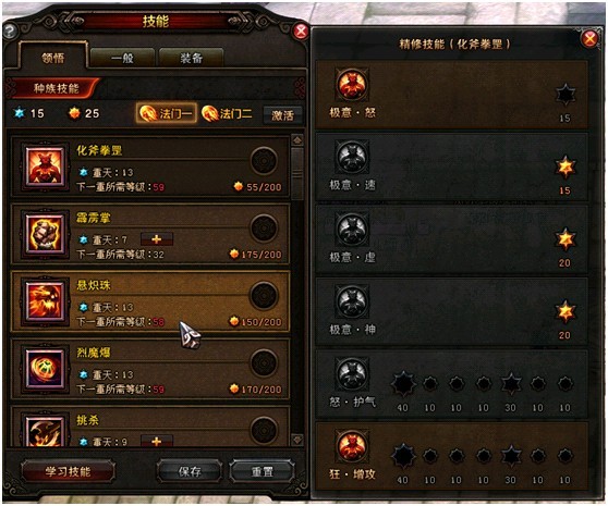 刷图手法很简单,boss小怪没区别。切速拿攻速7s的buff,平a打出气元珠(不需要特地选两个方向,因为一个方向也可以打出俩珠子),可以打多两轮确保怪物被打上裂骨印,放悬炽珠(放悬炽珠的时候长摁技能键,尽量在放的时候就开启珠子移动模式),继续平a打出气元珠,然后大招烈魔爆,之后就是无限平a等cd。该狂暴放狂暴,在狂暴在身的时候开怒啸长天加攻速骗团队评分(是不是说漏嘴了...),boss在脸前要K你的时候轻点格挡,血少激情挑杀。狂没有用的必要,全程速就行,可以切切状态加攻速。