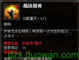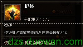 护身 猴子唯一的减伤技能 貌似之前还要书的 现在直接领悟了。。。。前期新手一直说猴子脆 跪的快 就是没有加这个的原因 这么说吧 我个人认为(个人认为 不是肯点)前期加!后期不加!为什么呢? 后期和好基友们一起打 仇恨保持好 就差不多了 到了你身上直接开平静 基友开嘲讽。。。全程