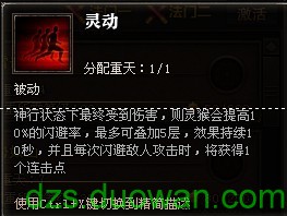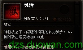 灵活!!!好东西当然第一个!加100的攻速。。。(永恒狗眼也只有30点有木有?)得技如此,猴崽何求?100的攻速已经很多了,这也是后期很多人点出神行长久的精修的原因。能快速攒豆子。满豆子满BUFF 破天 同时闪避体力消耗减少70%。。。PK神技 无限闪有木有?
