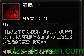 狂躁!回体力又额外消耗体力。。。在PVE中无视这条,因为我们不缺。要看的就是后面的30%伤害加成,加上前面的也就是90%了。。。