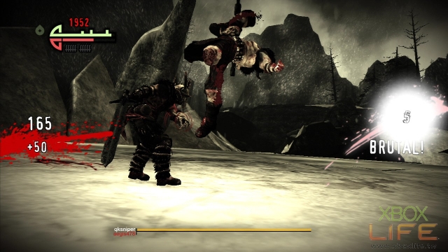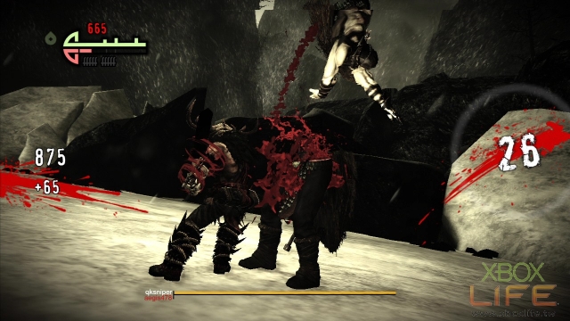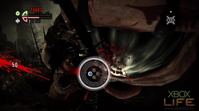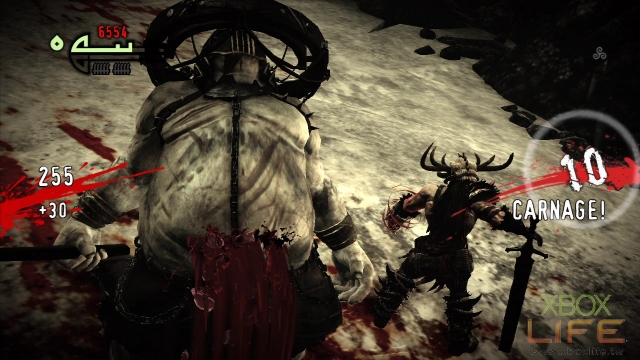 游戏除了一些固定外貌的杂鱼/小兵之外,当然还会出现体型比主角大上几倍的敌人,他的攻击力与耐打程度可见一斑,因此跟他们战斗时当然也会耗上不少血量与精力。为了立即把这些仇敌更快送到地狱去排队,你还能考虑施展愤怒杀技;当玩家进入狂暴模式时,朝着任一名敌人再次按下LB键与RB,即可做出一击必杀的愤怒杀技,爽快度满百。