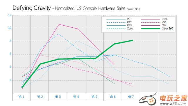 自2005年我们推出Xbox 360以来,我们已经售出6700万台主机,零售额突破了560亿美元,并在我们的第七个年头依然保持强劲态势。Xbox 360在本世代主机市场占据了47%的份额(译者注:应该是美国市场),我们之所以能迈出如此坚定的步伐得益于Kinect的成功(售出1900万)和Xbox Live上崭新的娱乐项目(4000万会员)。