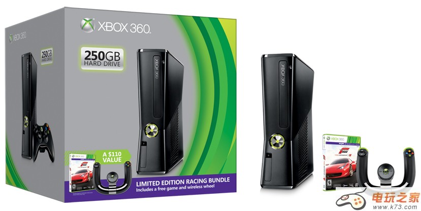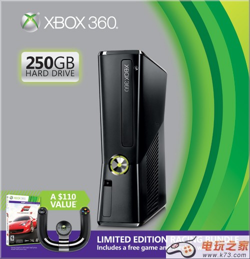 今日微软公布了Xbox 360 250GB Racing Bundle,该同捆版将于6月中旬开始零售。建议零售价为299美元,其中包括: