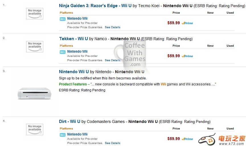 今天,亚马逊率先公布了WIIU游戏的实机版售价,而游戏的价格大概均在60美元左右,看来硬件提升对游戏售价的影响还是存在的。