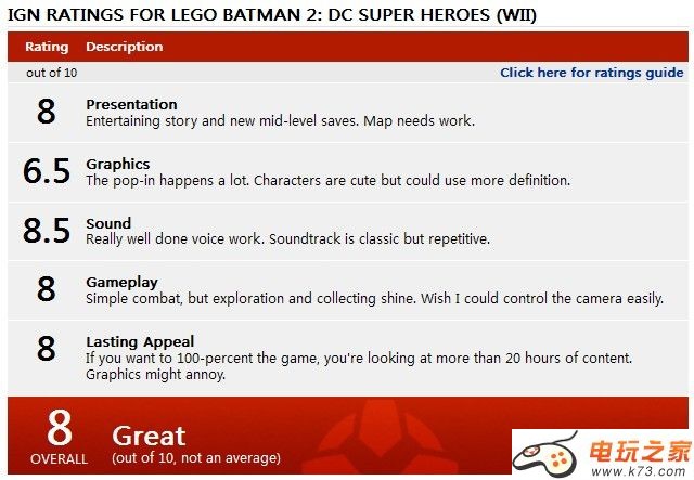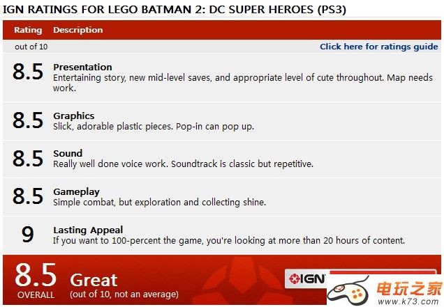 IGN网站日前公布了其最新一期的游戏评分,本次的评分对像为跨平台作品《乐高蝙蝠侠2 DC超级英雄》的PS3.XBOX360以及WII版本的评分,以下是具体的评分内容。