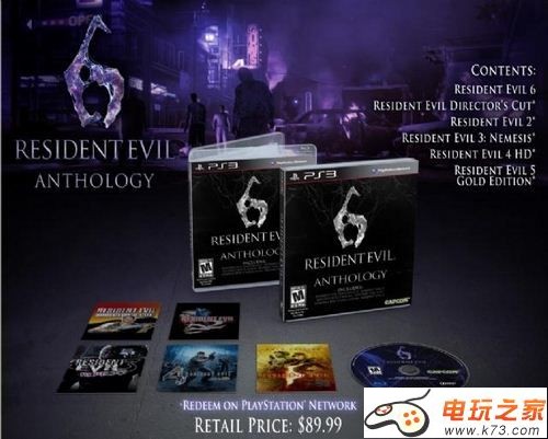 对于PS3版的《生化危机6文选》来说,包含有《生化危机6》游戏光碟、《生化危机导演剪辑版》的PSN兑换券、《生化危机2》、《生化危机3:复仇女神》、《生化危机4HD》、《生化危机5黄金版》。