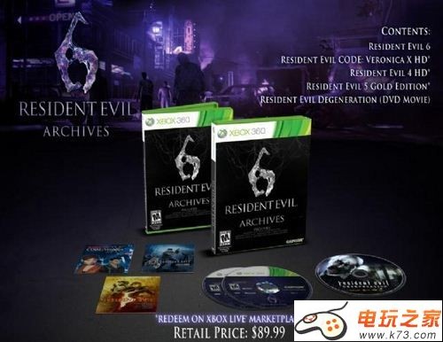 对于Xbox 360版的《生化危机6档案》来说,包含有《生化危机6》双碟装游戏、《生化危机:恶化》DVD以及《生化危机:维罗尼卡X》高清版、《生化危机4》高清版和《生化危机5黄金版》3个游戏的下载码。