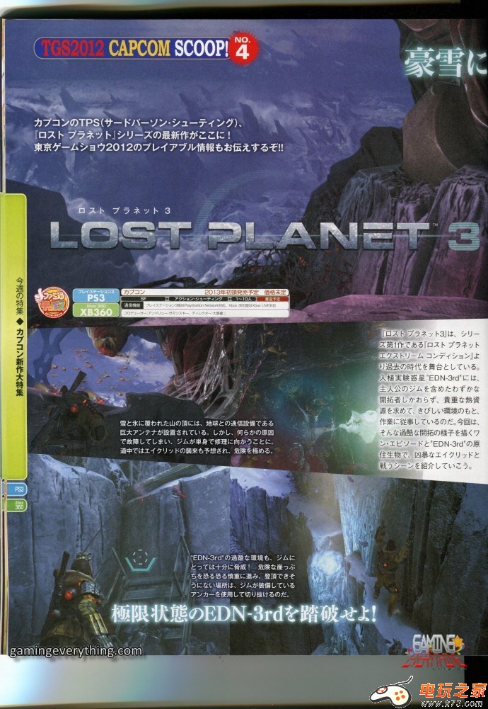 Capcom联合Spark工作室开发的PS3、XBOX360、PC平台游戏《失落的星球3》将于2013年正式发售。近期官方放出了最新一期的杂志图。