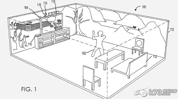 微软研发部门的专利图显示微软正在研发的方向是360度全景显示3D游戏,玩家可以利用自己家的墙壁和客厅空间进行游戏。这个革命性的设备,在内容上可以理解为“全景式显示”,玩家们通过升级的技术利用头戴显示器在房间的四面墙壁获得全息的游戏场景。